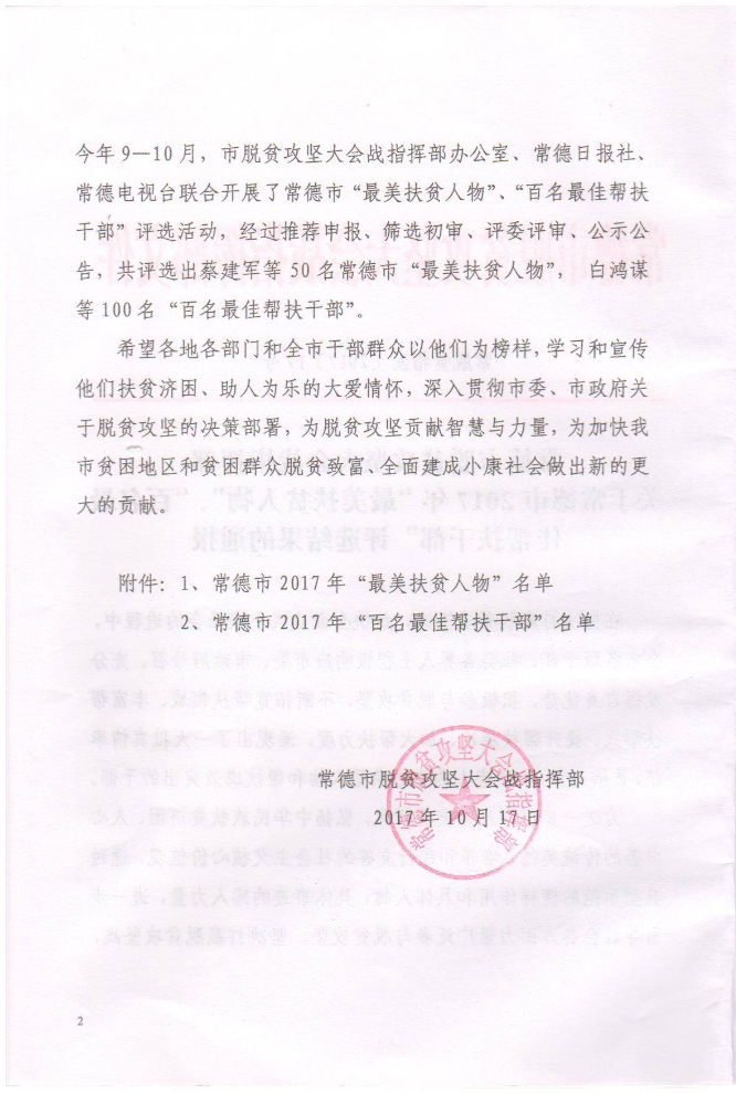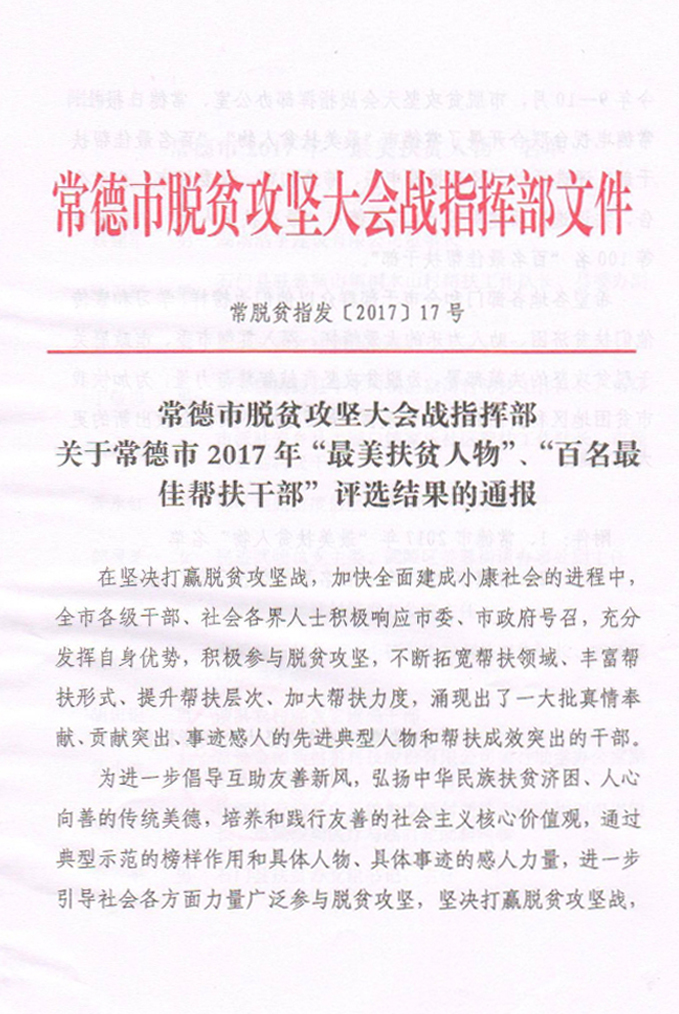 關(guān)于常德市2017年“最美扶貧人物”、“百名最佳幫扶干部”評選結(jié)果通報